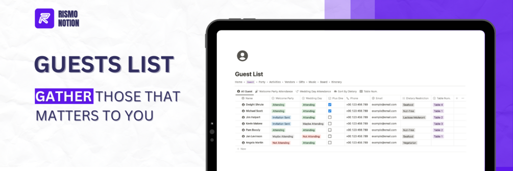- Guest List: Track attendance and special requirements to ensure a seamless experience for all your loved ones.